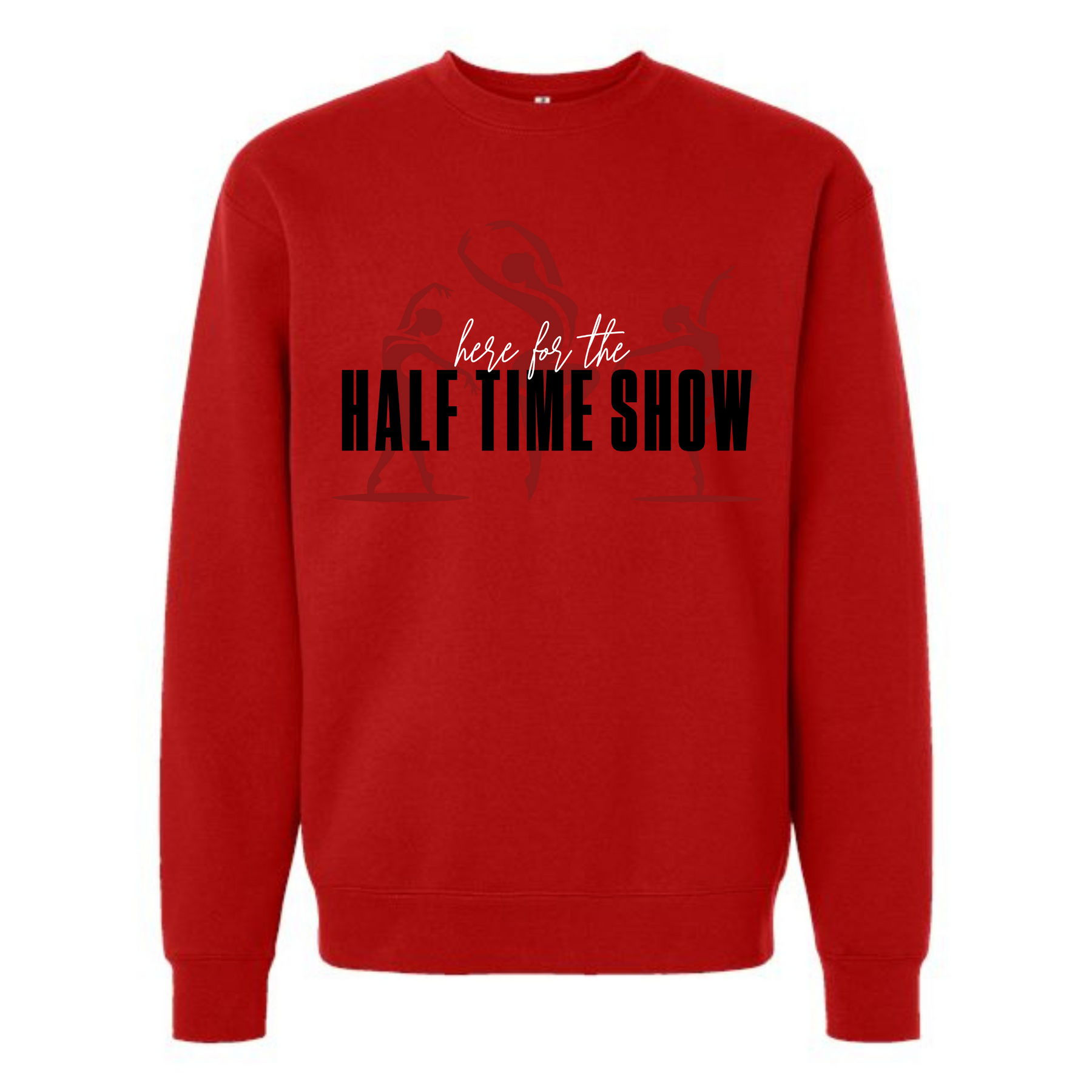 Make a statement in the stands with the Here for the Half Time Show sweatshirt. Featuring bold red lettering and sleek dancer silhouettes, this crewneck is perfect for fans who come for the performance as much as the game. With its cozy fleece feel and versatile design, it’s built for comfort, style, and school spirit.